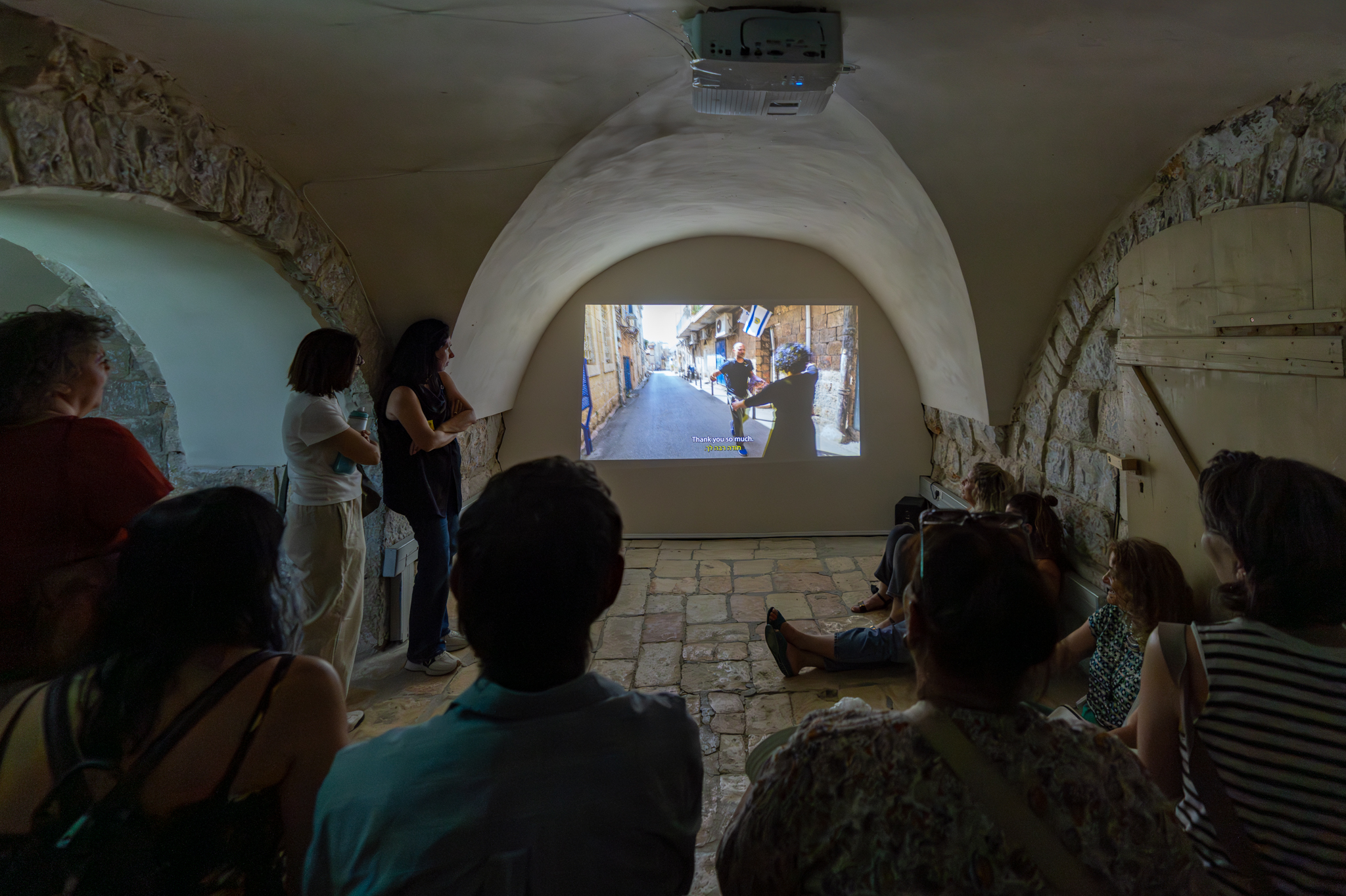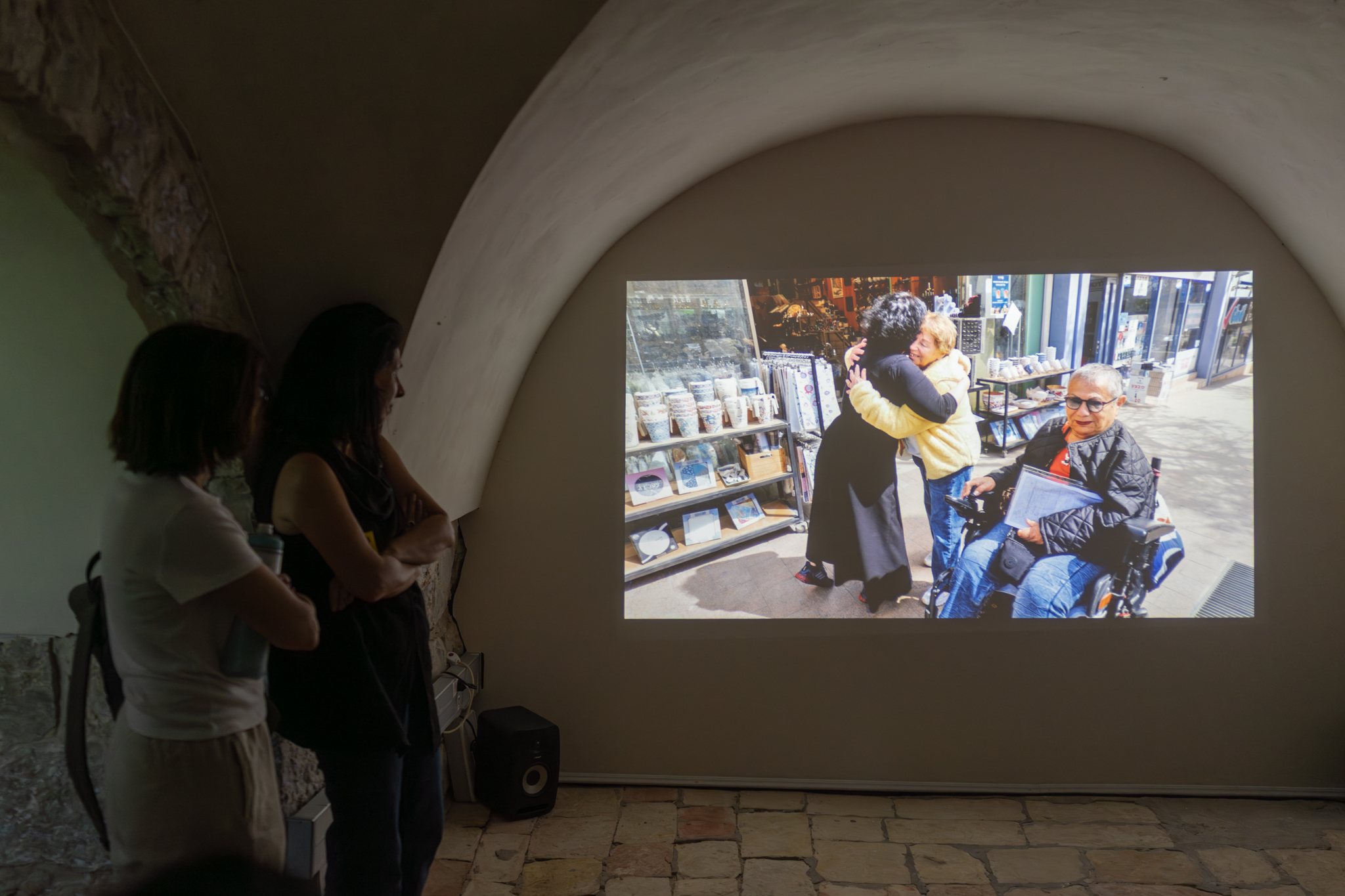 In artist Ruti Sela’s new exhibition at the Maamuta Art Center, four works are presented that explore the body, interpersonal relationships, and technology. The central work, Hugs 2025, is a recreation of her first video piece, Hugs (1999), a performance piece filmed on the streets of Jerusalem with the aim of collecting hugs from strangers. The entire exhibition gestures at the changes that have taken place over the past 25 years—from technological developments to shifts in values and ethics—and examines the demographic and political transformations in Israeli society and in Jerusalem over the past quarter century.