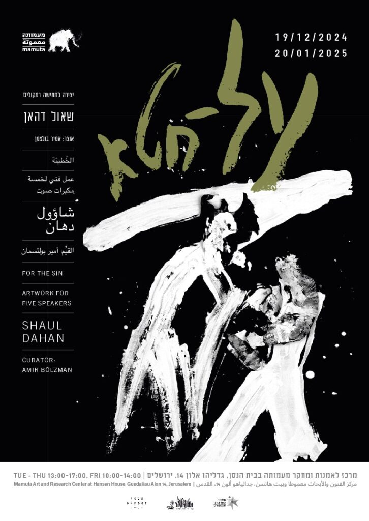 The sound work “For the Sin” is based on an adaptation of the confession prayer “Ashamnu” from the Selichot liturgical cycle, and examines the mechanism of confession. Through vocal presentation and musical arrangement, the creator challenges the original religious meaning and explores the relationship between the individual and the collective, exposing the tensions between personal confession and the broader social structure.