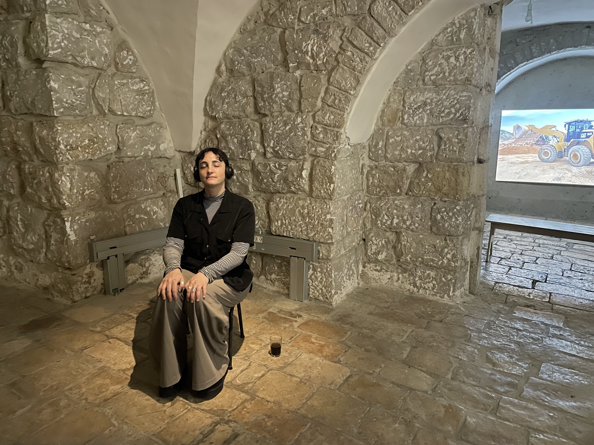 In the exhibition “Sonic Memory,” Eitan Haviv presents three new works. One installation was created following a dialogue with the late Dov Or-Ner, which began in the exhibition “DovOrNerNewWorks” shown at the Mamuta Center in 2023. In the work, which was meant to be a joint installation by Or-Ner and Haviv, salt water floats in steel bowls. Transmitters vibrate the bowls, which serve as resonance chambers and cause movement in the water. The resulting sonic reaction is haunting. Haviv uses experimental practices to produce sound from material.He states that he searches for the material’s resonance points to expose its natural composition or embodied frequencies. He considers the water bowls as vessels that contain sunken and embedded memories.