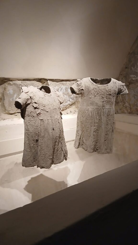 Opposite to it stands a young girl’s dress of ashes. Hannan Abu-Hussein made the sculpture from fabric and ashes: girls and boys; war; and the need to mourn each and every child.