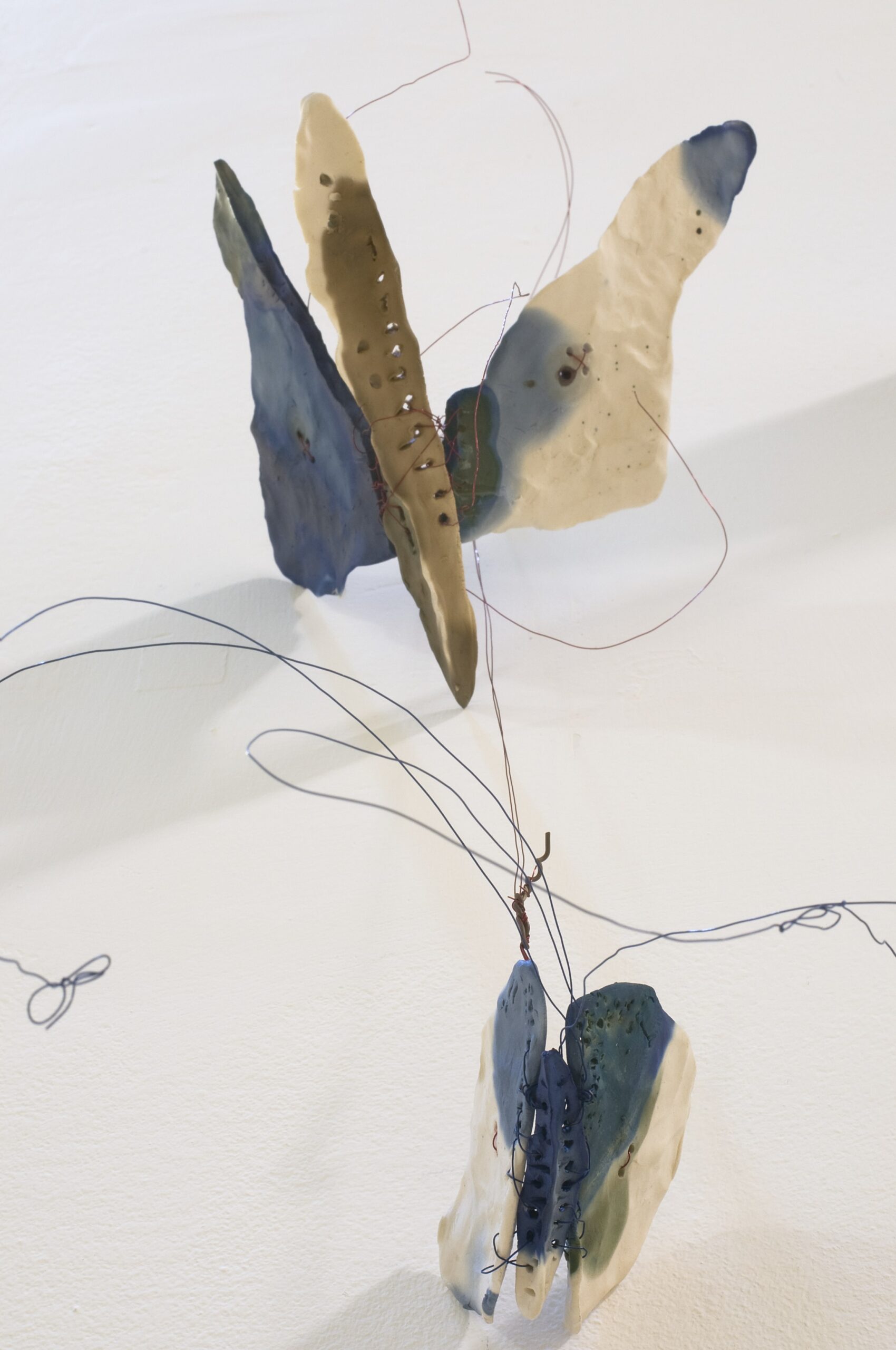 המזכרות החומריות מבית הסבים אינן הופכות לאנדרטאות, אלא משמשות כחומרי גלם לתהליך מחשבתי ועיבוד רגשי שנעים בין זיכרון העבר, הימצאות בהווה ומחשבה על העתיד. בשני קצוות החלל מוצבים בעלי החיים – פרפרי הדם והתנשמות. העבודה טייסת פרפרי דם, שנתנה את שמה לתערוכה, מאגדת את הניגודים המשתלבים בתערוכה כולה: מצד אחד הביתי, החמים, התמים והיפה; מצד אחר הדם, הכאב, הפחד והעצב. התחושות השונות והמנוגדות מתכנסות לכדי טייסת אחת, ספק להק מטוסים צבאי בתקיפה, ספק אישה המטיסה אותם ביד בוטחת. התנשמות הצופות בחלל מקצהו הנגדי מלוות את הצופה בשיטוט בין ובתוך התערוכה והמפה שהיא משרטטת, כשהן מתבוננות ומשגיחות על תהליך העיכול ועל פליטת מה שאינו ניתן לבליעה ולהטמעה.